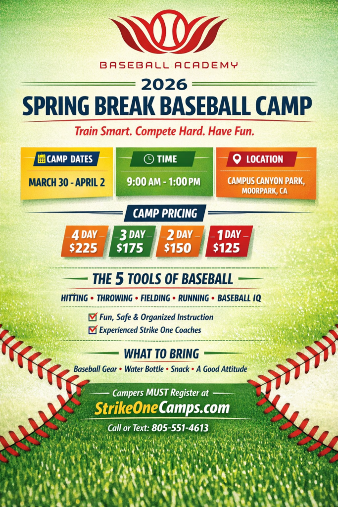 The Best Youth Baseball Camps and Clinics in Ventura and Los Angeles Counties. Youth Baseball camps located in Simi Valley, CA and surrounding areas. Our camps are hosted by professional coaches from Strike One Baseball Academy. Our youth baseball camps are for all ages and skill levels. We offer 1 to 5 day camps that run from 9am to 1pm.