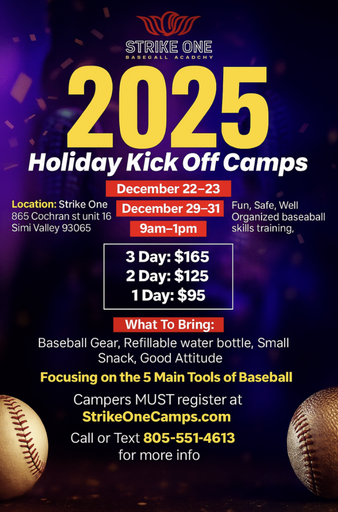 The Best Youth Baseball Camps and Clinics in Ventura and Los Angeles Counties. Youth Baseball camps located in Simi Valley, CA and surrounding areas. Our camps are hosted by professional coaches from Strike One Baseball Academy. Our youth baseball camps are for all ages and skill levels. We offer 1 to 5 day camps that run from 9am to 1pm.